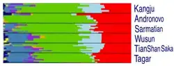 A genetic study published in Nature in May 2018 examined the remains of 6 Kangju buried between ca. 200 CE and 300 CE.[38] The 2 samples of Y-DNA extracted belonged to the paternal haplogroups R1a1a1b2a and R1a1a1b2a2b,[39][40] while the 6 samples mtDNA extracted belonged to the maternal haplogroups H6a1a, C4a1, U2e2a1, HV13b, U2e1h and A8a1.[41][40] The authors of the study found that the Kangju and Wusun had less East Asian admixture than the Xiongnu and Sakas. Both the Kangju and Wusun were suggested to be descended from Western Steppe Herders (WSHs) of the Late Bronze Age who admixed with Siberian hunter-gatherers and peoples related to the Bactria–Margiana Archaeological Complex.[12]