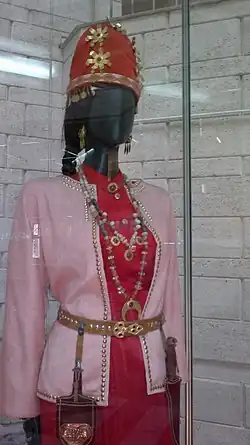 The ruling elite of the Kangju consisted of nomadic tribes whose customs were very similar to those of the Yuezhi. Kangju burials of the early period have been excavated at Berk-kara and Tamdî, in which the dead were placed in pit-graves, often covered with logs, under kurgan mounds. These graves often contain hand-made pots, iron swords, arrow-heads and jewellery. The burials show that the traditional culture of the Kangju resembled characteristics of the Saka.[2] From the beginning of the Christian era "catacomb graves" (in shaft and chamber tombs) became widespread. This is seen from the burials of the Kaunchi and Dzhun cultures of the 1st to the 4th centuries CE, which are generally accepted as having belonged to the Kangju.[2] The Kangju regarded the ram as a noble animal.[32]