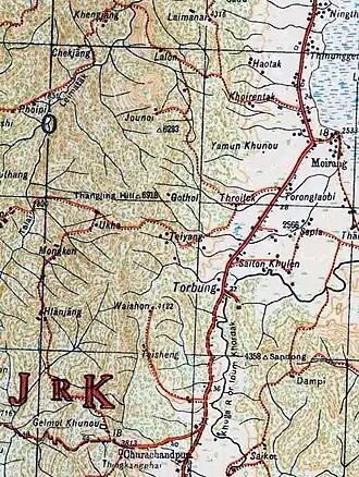 1944 Survey of India map of the region: the Kangvai settlements are shown to the east of Thangjing Hill, but not labelled