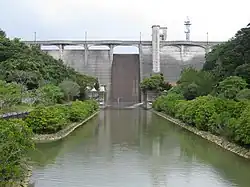 The Kanna Dam (漢那ダム) is a concrete gravity dam on the Kanna River in Ginoza, Okinawa Prefecture, Japan. The purpose of the dam is water supply and flood control. After studies were carried out in the 1970s(starting in 1973 and ending in 1978), construction on the dam began in 1982 and it was completed in 1992.[1] The dam is 45 m (148 ft) tall and 185 m (607 ft) long. In order to retain the reservoir, a 37 m (121 ft) tall and 500 m (1,640 ft) long saddle dam was constructed directly northeast of the dam.[2] A fish ladder was installed on the dam during construction to assist the migration of fish, shrimp and crabs. Mangroves downstream of the dam were restored after construction and the area is a tourist destination along with a habitat for water fowl.[3]