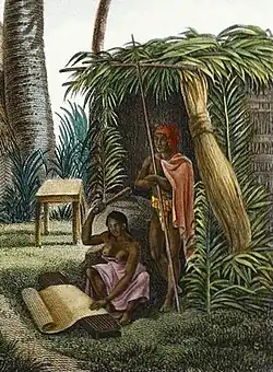 Cultural anthropologists over the course of the 20th century identified techniques in the creation of kapa that are unique to the Hawaiian Islands. Wauke (Broussonetia papyrifera) was the preferred source of bast fibres for kapa, but it was also made from ʻulu (Artocarpus altilis),[4] ōpuhe (Urera spp.),[5] maʻaloa (Neraudia melastomifolia),[6] māmaki (Pipturus albidus),[7] ʻākala (Rubus hawaiensis), ʻākalakala (R. macraei), and hau (Hibiscus tiliaceus).[8] In the 18th century, pieces of kapa were often made of grooving or ribbing. It is done by pushing the dampened cloth into the grooves of a special board.[9] The wauke tree is cut and soaked in water. It is then laid on a kua kūkū (polished stone tablet) and beaten with a hōhoa (rounded beater). After the first phase of beating, the kapa is transferred to a sacred house to be beaten a second time, but in a religious manner.