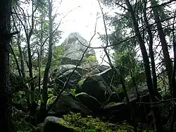 The Kapellenklippe is a tor near the Glassworks Way (Glashüttenweg) on the Renneckenberg mountain in the High Harz in central Germany within the borough of Wernigerode. The tor is in a remote spot in the Harz National Park and can only be reached over unsigned paths. The summit of the rocks is 927 m above sea level[1] and looks a bit like a bell. The tor is a popular destination for climbers. From its summit there is a view towards the Brocken. The tor is almost completely overgrown with pine trees and only projects a few metres above the tops of the trees.