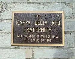 Kappa Delta Rho was founded in room 14 of Old Painter Hall at Middlebury College in Middlebury, Vermont on May 17, 1905.[2] Middlebury was the site of chapters of three fraternities that year: Chi Psi, Delta Kappa Epsilon, and Delta Upsilon. However, not finding these organizations to their liking, the founders of Kappa Delta Rho chose to create their new organization. Kappa Delta Rho was the created by ten men from the Middlebury Commons Club. The ten principal founders are George Edwin Kimball, Irving Thurston Coates, John Beecher, Pierce Wordsworth Darrow, Thomas Howard Bartley, Benjamin Edward Farr, Gideon Russell Norton, Gino Arturo Ratti, Chester Monroe Walch and Roy Dyer Wood.[3][1]