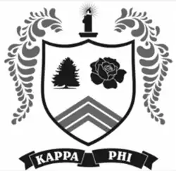 The Kappa Phi seal has a central lighted candle in a holder with the Greek letters ΚΦ at its base, encircled by the group's aim, a pine bough, and pine cone.[13] The society's crest has a silver shield with two azure blue chevrons at its base, a pink rose in the upper right corner, and a green pine tree in the upper left corner.[13] Above the shield is a lighted silver candle in a gold holder. Below the shield is a scroll with the society's name.[13] To either side of the shield are wreathes of green and silver.[13]