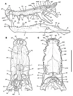 - ^ Turner, A.H.; Buckley, G.A. (2008). "Mahajangasuchus insignis (Crocodyliformes:Mesoeucrocodylia) cranial anatomy and new data on the origin of the eusuchian-style palate" (PDF). Journal of Vertebrate Paleontology. 28 (2): 382-408. doi:10.1671/0272-4634(2008)28[382:MICMCA]2.0.CO;2. S2CID 85634099.
