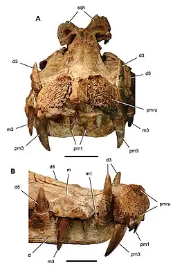 Kaprosuchus is an extinct genus of mahajangasuchid crocodyliform. It is known from a single nearly complete skull collected from the Upper Cretaceous Echkar Formation of Niger. The name means "boar crocodile" from the Greek κάπρος, kapros ("boar") and σοῦχος, soukhos ("crocodile") in reference to its unusually large caniniform teeth which resemble those of a boar.[1] It has been nicknamed "BoarCroc" by Paul Sereno and Hans Larsson, who first described the genus in a monograph published in ZooKeys in 2009 along with other Saharan crocodyliforms such as Anatosuchus and Laganosuchus.[2] The type species is K. saharicus.