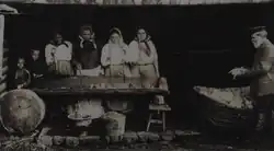 Russian peasants had a concept toloka (the art historian and museum curator Pyotr Dulsky (1879–1956) called this custom podmoga (подмога), "helping".[2] Toloka was helping fellow villagers with work they could not do on their own. Such help was common in harvesting and haymaking, as well as in preparing vegetables for winter. The toloka also served as a means of entertainment for young peasants. The tolokas in which peasant girls took place were kapustki (or kapustnitsa) and supryadki (yarn spinning). Kapustnitsa — helping to prepare cabbage for winter— was organized not only in the countryside, but also in small provincial towns. It was organized every year on the occasion of the Feast of the Cross (September 14 [27]). The work usually lasted more than two weeks and was finished only on Pokrov Day (October 1 [14]), when the marriage season usually began in the village. Usually 10 to 15 girls were invited (this number depended on the harvest and, accordingly, the expected amount of work) to be given away. After finishing work in one house, the girls would often move to another. They dressed smartly for work, expecting to attract the attention of their peers, and brought cleavers for cutting cabbage.[3]