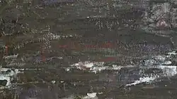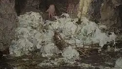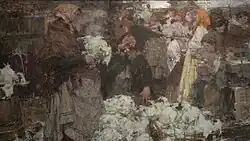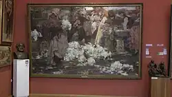 Kapustnitsa is a canvas painting measuring 219 × 344 cm.[Note 2][40] The artist, Nicolai Fechin, signed it in the lower left corner. It is part of the collection at the Research Museum of the Russian Academy of Arts in St. Petersburg and is displayed in its permanent exhibition (Hall No. 5).[41] The inventory number for this painting in the museum's collection is Zh-1498.[40][1][42] Nicolai Fechin left this painting, along with two others —Portrait of an Unknown Woman (also known as Lady in Purple, 1908, canvas, oil, 102 × 79 cm, State Russian Museum, Zh-2281)[1] and Exit from the Catacombs after Prayer (1903, canvas, oil, 91 × 199 cm, Research Museum of the Russian Academy of Arts, Zh-414)[43]— at the Imperial Academy of Arts.[44] These works were meant as models for students of the Higher Art School.[1][45] This tradition at the institution involved keeping the best works of students, from their early sketches to competition pieces, as "samples of academic education". These pieces were used for copying in classes, studying composition, and learning individual techniques. Kapustnitsa was left at the Academy immediately after its display at an exhibition there in 1909.[46]