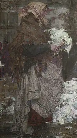 Galina Tuluzakova considered the two preparatory charcoal drawings for Kapustnitsa, depicting peasant women, as finished graphic works. One of them is an image of a woman holding a plate in her hands. It is drawn with several lines along the contours of the figure, the hands and the handkerchief. The figure, however, creates the illusion of volume. The lines reveal the construction of the body, detailing the requirements of anatomy. The drawing is laconic, but the gradations of the lines are varied. Some are bold and black, while others are thin and barely visible. The lines obey a restless rhythm, and the white space of the paper creates the illusion of an airy environment.[31][32]