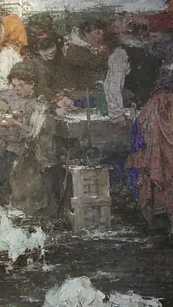 The artist succeeded in creating the effect of a shimmering pearly surface. Although Fechin's color palette is diverse, it is characterized by restraint. Nevertheless, in some fragments of the canvas, bright color combinations are used. One example is the juxtaposition of bright blue and yellow in the skirt of one of the peasant women in the left corner of the painting. Tuluzakova believed that here Fechin was anticipating the color contrasts of his Indigenous people's portraits, which he painted in Taos during the last period of his life. The painterly texture of "dense" colors creates the illusion of life and movement, creating an atmosphere of cheerful turmoil. Out of the "chaos of the colorful medley" emerge characters with distinct individuality, accentuated gestures and poses. Their movements are motivated by the action, but the narrative beginning is minimized.[8][70] The monolithic nature of the enthusiastic crowd, as in the painting Cheremis Wedding, is conveyed by Nicolai Fechin through the extreme density of the figures in the painting and the overlapping of the figures, as well as through the "middle tone of the painting", where the symmetry of the color spots (for example, the yellow shawl of the peasant woman in the foreground corresponds to the yellow spots of the shawl and skirt of the girl with the tray) gives the composition wholeness. The "vanishing point" coincides with the dark building in the background. According to Tuluzakova, it is the vertex of the triangle in which the artist has placed the scene. In Kapustnitsa, the depth of the space contrasts with the flatness of the painting, the volumetry of the image of signs with the decorative, graphic with the painterly, naturalism with the conventional.[8][9]