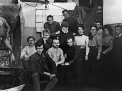 At the Kazan Art School, Fechin anticipated completing his final work, which he was not permitted to paint as a free student in academic workshops.[32][34] His arrival in Kazan was an event that attracted the attention not only of the students and teachers of the school, but also of the entire Kazan art community.[32] The new teacher immediately made a strong impression on the students. Especially their admiration increased when they saw the Kapustnitsa (Solovyov calls this canvas Kapustnik), which was placed in the assembly hall of the Kazan Art School to complete the work on it. It also made a great impression on the teachers of the school.[35] The artist German Melentiev wrote in his memoirs that when Fechin placed his unfinished work in one of the halls of the art school, all approaches to it were blocked. Curious students peered through the keyhole to see Fechin at work. One of the school employees, feeling sorry for the students, began to open the hall for them when Nicolai Fechin was absent. The students, fearing the artist's return, only had brief glimpses of the unfinished canvas, struggled to understand the subject, but were nonetheless struck by the master’s immense size and unconventional technique. The diffuse light in the hall gave the painting an "enchanting and exciting" character.[36]