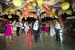 During the Soviet period, as a consequence of Kazakh famine, collectivization and urbanization, Kara Jorga song and dance were almost lost and became subjects for research and experimental elements for Kazakh ballet.[2] However, these traditions were preserved by Kazakh who survived famine by fleeing to China in the early 20th century, which was reported by National Geographic reporters in the 1950s of the 20th century.[3] It was then popularized in Kazakhstan since the post-independence period, mostly by Kazakh repatriates from China and Turkey, such as Arystan Shadetuly – a professional Kara Jorga dancer. The first music video released by Kazakhs in China in 2009. Several flash mobs were staged both in China and Kazakhstan.[4] The largest Kara Jorga dance was achieved in Astana by 399 performers on 16 December 2011.[5]