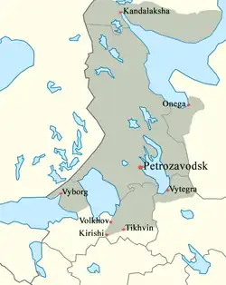 Stop the Occupation of Karelia also claims territories lost by Finland after the Winter War, including the city of Vyborg to be belonging to an independent Karelian state.[20] Their claims also include Kandalaksha, the southeast of the Kola peninsula and the towns of Onega, Tikhvin and Vytegra and Kirishi.[10]