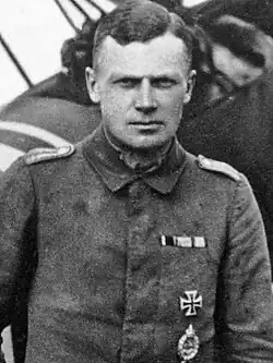 He opened his tally with Jagdstaffel 2 on 25 April 1918, as part of a huge air offensive launched to support ground assault on Kemmel Ridge.[3] He then began a steady collection of single and double victories, with five in May, seven in June, nine in July and three in August. In August, 1918, when he had scored 28 victories, he received the Military Merit Cross, and the Royal House Order of Hohenzollern; the Pour le Mérite (commonly known as the Blue Max) was bestowed on the 28th.[2]