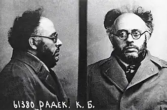 Karl Berngardovich Radek (Russian: Карл Бернгардович Радек; 31 October 1885 – 19 May 1939) was a revolutionary and writer active in the Polish and German social democratic movements before World War I and a Communist International leader in the Soviet Union after the Russian Revolution.