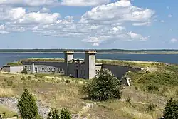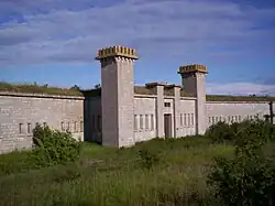 In 1831 cholera reached the Baltic coast and a quarantine station was established on the island. A cholera hospital was also built.[2] Slite Harbour had since olden times been fortified, but the fortification, which in the 1650s was built on Enholmen and later was called Karlsvärd was long since decayed, when the 1839 Fortification Committee suggested that a new fortification was to be established to protect the harbour.[3] Nothing was, however, done with this, but when the Crimean War broke out in 1853 and the Baltic Sea became a probable theater of war, it was quickly decided that Enholmen's once again would be fortified, and during 1854–58 two casemate fortification were built underneath the former Karlsvärd's dilapidated eastern and western fronts, exclusively for artillery defense of the two inlets to Slite.