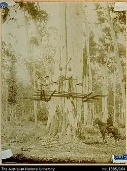 Karridale was established as a timber mill in 1884 by M. C. Davies who saw the potential from large virgin forests of Karri trees (Eucalyptus diversicolor) in the area.[3] The Karridale School opened in 1888.[4] At its peak the town was home to 300 men and their families who worked in the forest and at the M.C.Davies Karri and Jarrah Timber Company mill.
