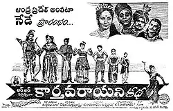 Karthavarayuni Katha (transl. Story of Karthavaraya) is a 1958 Indian Telugu-language Hindu mythological film, produced and directed by T. R. Ramanna under the R. R. Pictures banner.[2][3] It stars N. T. Rama Rao, Savitri[4] with music composed by G. Ramanadhan and Ashwathama.[5] The film was simultaneously made as the Tamil movie Kathavarayan (1958) by the same banner and director.