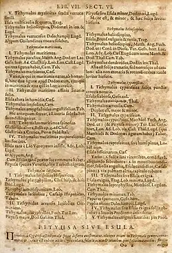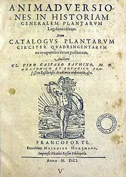 The Pinax theatri botanici (English, Illustrated exposition of plants) is a landmark of botanical history, describing some 6,000 species and classifying them.[1] The classification system was not particularly innovative, using traditional groups such as "trees", "shrubs", and "herbs", and using other characteristics such as utilization, for instance grouping spices into the Aromata. He did correctly group grasses, legumes, and several others. His most important contribution is in the description of genera and species. He introduced many names of genera that were later adopted by Linnaeus, and remain in use.[2] For species he carefully pruned the descriptions down to as few words as possible; in many cases a single word sufficed as description, thus giving the appearance of a two-part name. However, the single-word description was still a description intended to be diagnostic, not an arbitrarily-chosen name (in the Linnaean system, many species names honor individuals, for instance).