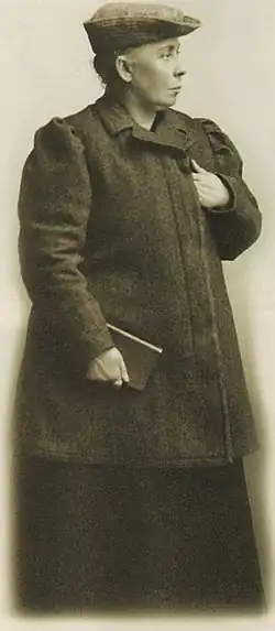 As a lecturer, she was initially engaged in the organizing of working-class women, but expanded to include all the spheres of the working-class movement. She placed her main focus on trade union activity, organizing the workers of the textile industry, railroad, miners and others within the trade union, as she regarded strikes as an efficient method to achieve suffrage.[1] She was engaged in Swedish trade union work from 1898, and a member of the committee organizing the great strikes of 1905, 1908 and 1911. With her powerful agitation, she reportedly had the ability to awake great enthusiasm: her fiery, aggressive and drastic speeches made her one of the most popular and efficient agitators of the Swedish working-class movement, and her ability to excite the masses and give them courage to keep fighting during conflicts with the authorities and in the midst of disappointments, especially during the great strikes of 1902 and 1909, has been described as an unusual one.[1]