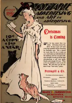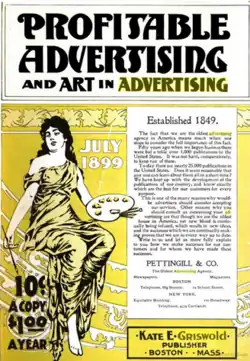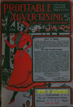 Profitable Advertising absorbed Charles Austin Bates' Current Advertising, together with Returns, of San Francisco, and opened a New York City office besides the Boston office on Nassau Street.[2] Of more than 200 advertising publications that were launched at various times during the years 1888–1903, approximately 30 continued to publish and were listed in the American Newspaper Directory. She became the owner of Profitable Advertising in 1895. Founded as an organ for the C. F. David advertising agency in 1891, it ran indifferently for a year, when Griswold took editorial charge. There was not much of a foundation for a successful periodical when the agency went out of existence in 1895, but Griswold she put the publication upon an independent editorial and business basis, and maintained the journal on that basis thereafter, gradually evolving a successful monthly that was circulated upon its merits and filled a very tangible need in the advertising world. Where advertisers take two trade journals those two are pretty certain to be Profitable Advertising and George P. Rowell's Printers' Ink.[5]