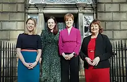 Forbes outside Bute House following her appointment to the Scottish cabinet, 17 February 2020. (From left to right; Jenny Gilruth, herself, First Minister Nicola Sturgeon, and Fiona Hyslop.)