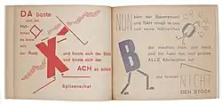 Steinitz collaborated with her friend Kurt Schwitters on several projects, including children's books, opera librettos, books, and festivals.[3][6] Together with Theo van Doesburg, Schwitters and Steinitz produced several children's fairy-tale books that featured unusual typography, including Hahnepeter (Peter the Rooster, 1924), Die Märchen vom Paradies (The Fairy Tales of Paradise, 1924–25), and Die Scheuche (The Scarecrow, 1925).[7] For the publication of their work, the artists founded their own publishing house, which they called APOSS, an acronym that stood for "A=active; P=paradox; OS=oppose sentimentality; S=sensitive."[7]