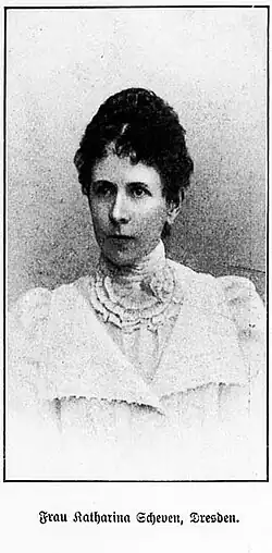 Katharina Bauch was born in 1861. She became Katharina Scheven through marriage to Paul Scheven (1852–1929) of Zittau, an economist, philanthropist and publicist in Dresden, editor since 1904 of the journal Volkswohl ("People's welfare"). She probably worked as a teacher in Dresden, engaged in the training and education of girls. She was the author of a petition by the "Association of progressive women's associations" that demanded the establishment of a girls' high school in Dresden, but was rejected by Mayor Beutler. She also founded organizations dedicated to women's rights.[1]