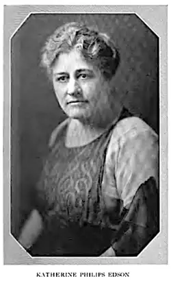 Katherine Philips was born in Ohio in 1870. Her father was a Union surgeon in the civil war who was also a strong supporter of women's rights.[2] Katherine studied in Kenton, Ohio where she attended several public schools. During her earlier years, she studied at the Convent of Sacred Heart in Clifton. She then left to Chicago in order to receive the voice training that she wanted. While in Chicago, she attended the Chicago Conservatory, where she also met Charles Farwell Edson, who eventually became her husband in 1890 (they divorced in the year 1925). Edson was the nephew of prominent Chicago businessman John V. Farwell and Senator Charles B. Farwell. Soon after getting married, Katherine and Charles moved to Antelope Valley, California where she spent the next nine years. Katherine became the active leader in the Women's Suffrage Movements while residing in Antelope Valley.[3] Katherine and her husband eventually decided to move to Los Angeles, California where she joined the Friday Morning Club in the year 1900. The Friday Morning club was a women's club founded by Caroline M. Severance. This club had over three thousand members at the time. The Friday Morning Club advocated for public reforms and organized local health campaigns.[4] Katherine became secretary of the Friday Morning club within a year of being an active member. While a member of the club, Katherine worked on municipal reforms and she was a key component in the women suffrage amendment that was added to the state constitution in 1911. Edson strongly believed that women had important interests outside of their household work and it was their task to stand up against unhealthy conditions. She also believed that women should be treated as full citizens of the United States rather than half citizens. Edson's political activism led her to make changes within our legislation. She pushed for better working conditions as well as women's rights. The unfair treatment of women outside of their household duties, led Katherine Edson to actively fight for women's rights. Even after her death, Edson's work continued to influence activists around the United States to stand up against social injustice.