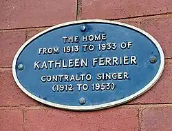 The Ferrier family originally came from Pembrokeshire in South West Wales. The Lancashire branch originated in the 19th century, when Thomas Ferrier (youngest son of Private Thomas Ferrier of the Pembrokeshire Regiment) settled in the area after being stationed near Blackburn during a period of industrial unrest.[2] Kathleen Ferrier was born on 22 April 1912, in the Lancashire village of Higher Walton where her father William Ferrier (the fourth child of Thomas and Elizabeth, née Gorton) was the head of the village school. Although untrained musically, William was an enthusiastic member of the local operatic society and of several choirs, and his wife Alice (née Murray), whom he married in 1900, was a competent singer with a strong contralto voice.[3] Kathleen was the third and youngest of the couple's children, following a sister and a brother; when she was two the family moved to Blackburn, after William was appointed headmaster of St Paul's School in the town. From an early age Kathleen showed promise as a pianist, and had lessons with Frances Walker, a noted North of England piano teacher who had been a pupil of Tobias Matthay. Kathleen's talent developed quickly; in 1924, she came fourth out of 43 entrants at the Lytham St Annes Festival piano competition, and in the following year at Lytham she achieved second place.[4]