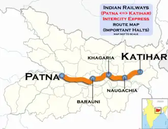 The 15713 / 14 Katihar - Patna Junction Intercity Express is an Express train belonging to Indian Railways Northeast Frontier Railway zone that runs between Katihar Junction and Patna Junction in India.