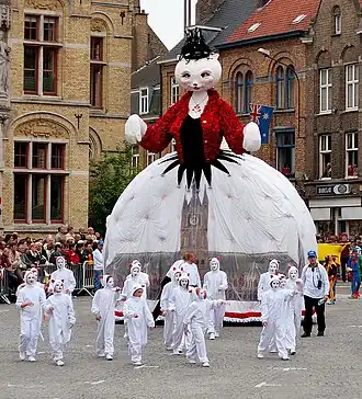 The Kattenstoet (lit. 'Festival of the Cats' or 'Cat Parade') is a parade in Ypres, Belgium, devoted to the cat. It has been running regularly since 1955 and is usually held triennially on the second Sunday of May.[3] The parade commemorates an Ypres tradition from the Middle Ages in which cats were allegedly thrown from the belfry tower of the Cloth Hall to the town square below.