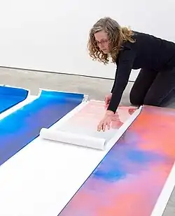Stone's installation artworks were shown in solo exhibitions at the Greg Kucera Gallery, Seattle in 2002, and in 2003 at Suyama Space, Seattle, WA.[15][16][17] In 2005 Stone created a site-specific installation for her solo exhibition at The Boise Art Museum.[15] In 2006 Stone designed a sculptural installation forming "gentle colored rains, spattering down and around her cascades of transparent sheets" which was exhibited at the Patricia Faure Gallery in Los Angeles alongside paintings by Llyn Foulkes.[18] In 2008 Stone's solo exhibition A Season Swirling (Unfurling) took place at the Missoula Art Museum, Missoula, MT.[19] Stone lived in Montana from 1996-2001 and the central theme of her Missoula exhibition was "based on the Montana landscape and the artist's impressions and memories of the rhythm of its seasons."[19] In 2013 Stone's artwork Lunar Drift (2011) was included in the exhibition Flow just Flow, held at the Harnett Museum of Art, University of Richmond.[20] In 2019 Stone's solo exhibition Once Upon A Time was organized by the Kansas City Art Institute.[21] In 2020 Stone's solo exhibition Light Currents was held at the Ryan Lee Gallery, New York.[14]