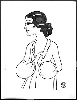 ![]() actress Katy Valentin wearing a dress with puff sleeves in a role ("Youth: A Play in Three Acts"? by Miles Malleson, drawn by Valdemar Møller. from 1928 | |