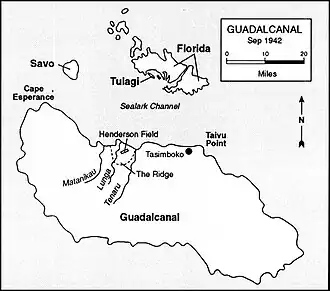 Guadalcanal in September 1942, showing Taivu Point (the first detachment landing) and Henderson Field (the planned point of attack)