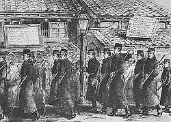 Before the 1871 abolition of the han system, which effectively removed the daimyōs and bugyōs from their official positions, the new Japanese capital of Tokyo was patrolled by mixed troops of samurai. On 29 August 1871, a special force, modeled after Western-style National Gendarmerie, was organized. The influence of the French system was highlighted by Fukuzawa Yukichi, who visited France in 1869.[4] Known as rasotsu, Kawaji and Saigō Takamori (a senior samurai also hailing from the Satsuma Domain) were tasked with the recruitment of patrolmen.[2][6] A total of 2,000 patrolmen initially formed the rasotsu due to Kawaji and Saigo's efforts, and an additional patrolman was recruited for every 3,000 city inhabitants in every prefecture outside Tokyo. As of 1872, the estimated total Japanese population was 34.8 million, around 900,000 of which were in Tokyo.[17] This was followed by the voluntary surrendering of traditional samurai wear and weaponry.[18]