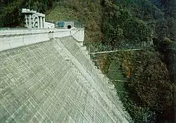 The upper reservoir for the power station is created by the Kamihikawa Dam at 35°42′58″N 138°49′57″E / 35.71611°N 138.83250°E which is a 87 metres (285 ft) tall and 494-metre (1,621 ft) long rock-fill embankment type. It has a fill volume of 4,110,000 cubic metres (5,380,000 cu yd). The upper reservoir's capacity is 11,470,000 cubic metres (9,300 acre⋅ft) of which 8,300,000 cubic metres (6,700 acre⋅ft) is active (or "useful) for power generation.[2] The lower reservoir is formed by the Kazunogawa Dam (葛野川ダム), which uses water from the Sagami River system. The Kazunogawa Dam is 105.2 metres (345 ft) tall and 263.5 metres (865 ft) long roller-compacted concrete gravity dam. It has a structural volume of 622,000 cubic metres (814,000 cu yd). The lower reservoir's capacity is 11,500,000 cubic metres (9,300 acre⋅ft) of which 8,300,000 cubic metres (6,700 acre⋅ft) is active (or "useful) for pumping into the upper reservoir.[3]