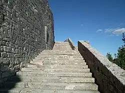 Two monuments give access to the upper public garden on the terraces, the spiral staircase of an old turret defense, which is a remnant of the castle destroyed in 1622, and the Grand Escalier (great staircase) of César Phoebus d'Albret, which was designed in 1665. The latter has five flights punctuated by six levels and connects the upper gardens to those made at the foot of the ramparts and the Seugne. It allows visitors to see the ancient medieval wall of the twelfth century and the terrace built in 1630 on the cliff. These 17th century stairs, were built by Lord of Pons, Pierre Dugua following his return from his renown explorations and settlements in New France (modern-day Canada).[10]