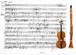 The manuscript notes the clarinet part as "Clarinetto in B" and uses the written pitch. The viola part uses the C-clef in the alto position. The labelling of the piano part shows a correction by Mozart where he started to write "Ce" (for "cembalo", the Italian word for the harpsichord) and then replaced it with "Piano forte". However, this part is labelled "Cembalo" for the second and third movements. The key signature of E major in Mozart's late chamber music indicates close friendship.[9]