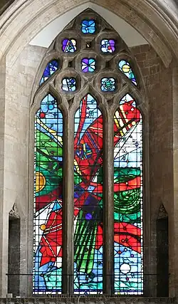 A number of circumstances stimulated New to change direction at the end of the 1960s. A key driver was the challenge of maintaining momentum as a one-man band, no matter how skilled and inspiring his approach.[5] Allied to this was the slowing down of commissions for an expensive art form; architects were beginning to use glass in their buildings in different ways. Where French artists, like Fernand Léger and Henri Matisse, had influenced the great flowering of immediate post-war British stained glass,[36][37] by the late 1960s it was German artists, such as Johannes Schreiter and Ludwig Schaffrath,[38] as well as advances in glass manufacture that led the way.[39]