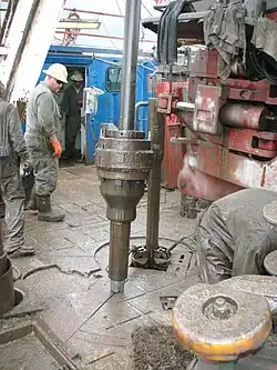 A kelly drive is a type of well drilling device on an oil or gas drilling rig that employs a section of pipe with a polygonal (three-, four-, six-, or eight-sided) or splined outer surface, which passes through the matching polygonal or splined kelly (mating) bushing and rotary table. This bushing is rotated via the rotary table and thus the pipe and the attached drill string turn while the polygonal pipe is free to slide vertically in the bushing as the bit digs the well deeper. When drilling, the drill bit is attached at the end of the drill string and thus the kelly drive provides the means to turn the bit (assuming that a downhole motor is not being used).