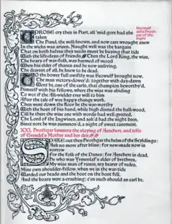The Kelmscott Beowulf is considered Morris's "most problematic" book project. The text was based on A. J. Wyatt's prose translation. Morris adapted the translation into verse format, and made some of the language more archaic.[56] He developed the Troy font for the Beowulf. The 300 paper copies sold for about 2 guineas each.[56] Morris's biographer, E. P. Thompson, described it as "perhaps the worst thing he ever wrote" in 1991.[57] Beowulf translator James M. Garnatt was disappointed with the translation, stating that it was "bordering on unintelligibl[e]".[58] When the book was first published, Theodore Watts wrote in The Athenaeum that the work was a success.[57] Andy Orchard, professor of Anglo-Saxon at the University of Oxford,[59] noted that Morris's translation was very faithful to the original syntax and words, especially with the compounds he created like "shade-goer" and "horn-house".[60] According to Old English scholar Roy Liuzza,[61] Morris tried to re-create Beowulf in a type of English that was as removed from modern English as the vernacular speech of Anglo-Saxons was from the original Beowulf. In so doing, Morris avoided romance words and wrote in an elaborate medieval style that appears to the modern reader as "most obnoxious".[62] Nevertheless, Morris was trying to "make the poem speak to [him] in [his] own language."[63] The included glossary, which Morris did not want to include, was inadequate.[64]