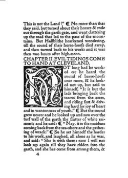 Kelmscott Press's first book was one of Morris's own novels, The Story of the Glittering Plain, which was published in May 1891 and soon sold out. The Kelmscott Press published 23 of Morris's books, more than those of any other author.[51] Morris used paragraph symbols instead of indentations to achieve the blocky looks that he preferred. Morris sold the first copy to Wilfrid Scawen Blunt for one pound. [52] Similar to the William Caxton's renaissance printing practice, Kelmscott Press printed editions of poetry, Morris's own works, and medieval romance and poetry.[31] Kelmscott printed an American edition of Hand and Soul by Dante Rossetti in 1895 which was distributed by Way and Williams Publishers.[53] The press published editions of works by Keats, Shelley, Ruskin, and Swinburne, as well as copies of various medieval texts.