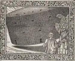 Some of the Kelmscott books are heavily decorated, with motifs similar to Morris's other designs for upholstery and wallpaper. In 1913, Holbrook Jackson wrote: "The Kelmscott books look not only as if letter and decoration had grown one out of the other; they look as if they could go on growing."[43] The title pages of Kelmscott books were usually decorated in a Victorian style.[31] Morris initially designed woodblock initials that were too dark or too large for the pages they appeared on, but later became more proficient in proofing his capitals.[44] The Kelmscott books varied greatly in ornaments; while The History of Godefrey of Boloyne is "over-decorated",[45] the first few books published by Kelmscott were sparsely decorated. Morris's border and capital designs were very similar to his wallpaper designs, and were not illustrative of the texts they adorned. While medieval texts had delicate illuminations covering their margins, the wood engravings Morris made in imitation of them were very heavy, and created production problems in the Chaucer, requiring the hand press to be reinforced with steel because of the weight of the large ornaments. [46] At times Morris preferred that his wood engravers replicated his designs exactly, even though this was at odds with John Ruskin's theory that craftsmen should have influence in the final aesthetic product they help produce.[47] Kelmscott books did not have printing on the reverse side of woodblock pages until the Chaucer, but this separation of text from illustration was precisely what Morris wanted to avoid in his book designs.[48]