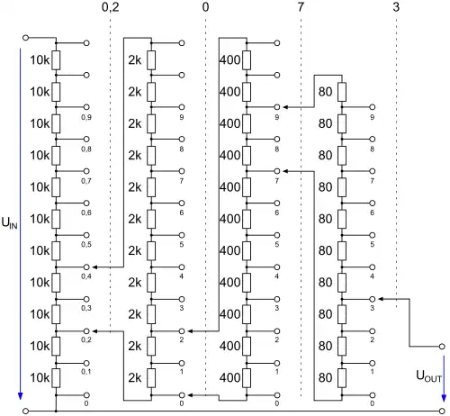 To overcome this limitation, the Kelvin–Varley divider uses an iterated scheme whereby cascaded stages consisting of eleven precision resistors provide one decade of resolution per stage. Cascading three stages, for example, therefore permits any division ratio from 0 to 1 in increments of 0.001 to be selected.