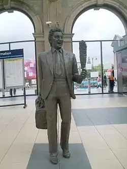 In a 2005 poll of comedians and comedy insiders to find the 'Comedians' Comedian', Dodd was voted amongst the 'Top 50 Comedy Acts Ever', ranked as number 36.[44] He was made an honorary fellow of Liverpool John Moores University in 1997. A statue depicting Dodd with his trademark "Tickling Stick" was unveiled in Liverpool Lime Street railway station in June 2009. It was temporarily removed in 2017 for renovation works.[45]