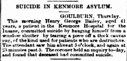- ^ "Death at Kenmore Asylum". The Sydney Morning Herald. Sydney, NSW: National Library of Australia. 17 February 1903. p. 6. Archived from the original on 2 February 2017. Retrieved 27 January 2017.