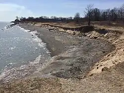 Aerial photos dating back to the late 1930s indicate that significant erosion has taken place over the decades.[5] But that erosion has been uneven. The north and south shorelines protected with large stone revetments have been stable. The larger central portion of the dunes, which is largely unprotected, has been badly eroded.