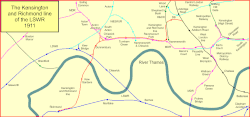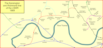 The Kensington and Richmond line was a railway in West London, England. It was built by the London and South Western Railway, which already had a main line to Richmond from London. The Kensington line was chiefly a defensive measure to limit the incursion of rival railways into LSWR territory. It ran from Kensington on the West London Railway, by way of Hammersmith, Turnham Green, Gunnersbury and Kew; it opened in 1869. It had a separate station at Richmond, in keeping with the LSWR intention of preventing competitors from easily obtaining running powers to go further into the LSWR area.