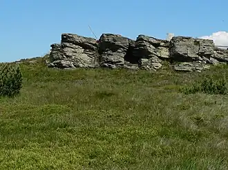 Geologically, the Keprník massif belongs to the unit known as the Keprník Dome[17] and is composed of metamorphic rocks, mainly gneisses (biotite), orthogneisses, erlan, mylonites, blasto-mylonites, migmatites, schists, and igneous rocks, primarily meta-granites.[18] The geological structure also contains admixtures of gemstones such as staurolite, andalusite, garnet, and sillimanite.[18] The summit features cryoplanation terraces and frost cliffs formed during the Pleistocene in a periglacial climate. It is likely that a small mountain glacier existed on the southeastern slope during this period, leaving behind the so-called Keprnický kar.[19]